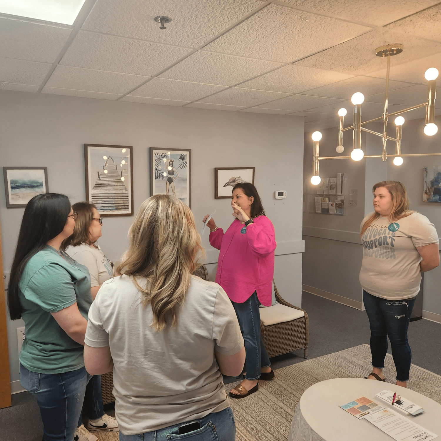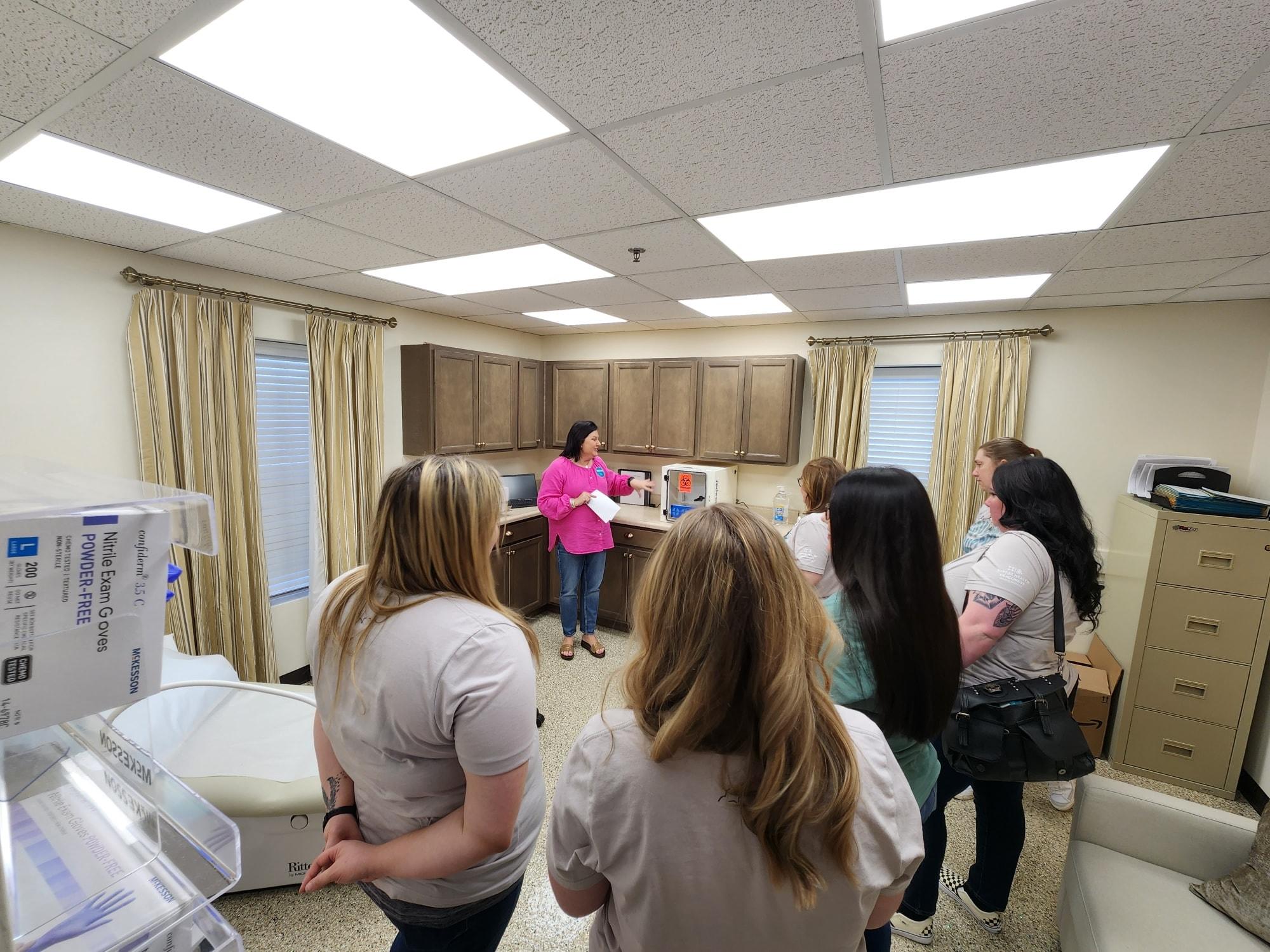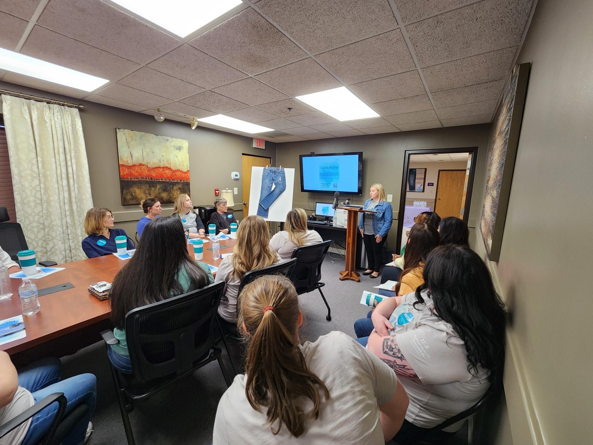 - SAFE Room coordinator Amanda Sholar shows nurses the Group Room at Sanctuary where clients can sit during or after their exam.