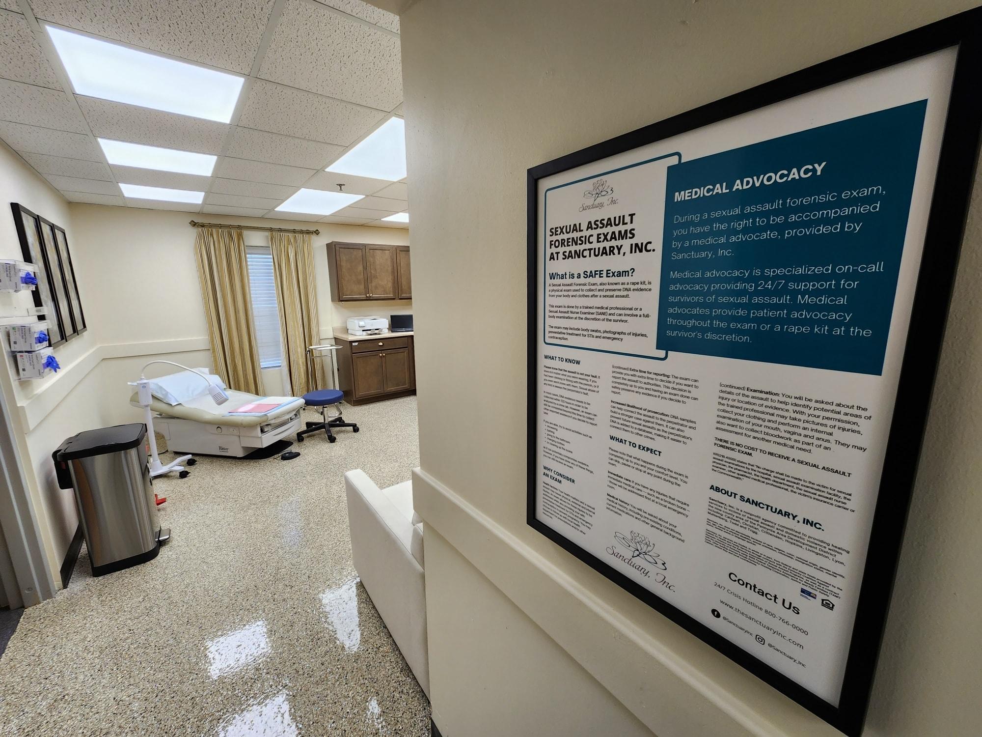 Information on the wall explains each step of the SAFE exam, explaining that clients can consent or deny any part of the exam. All sexual assault exams are free and confidential.